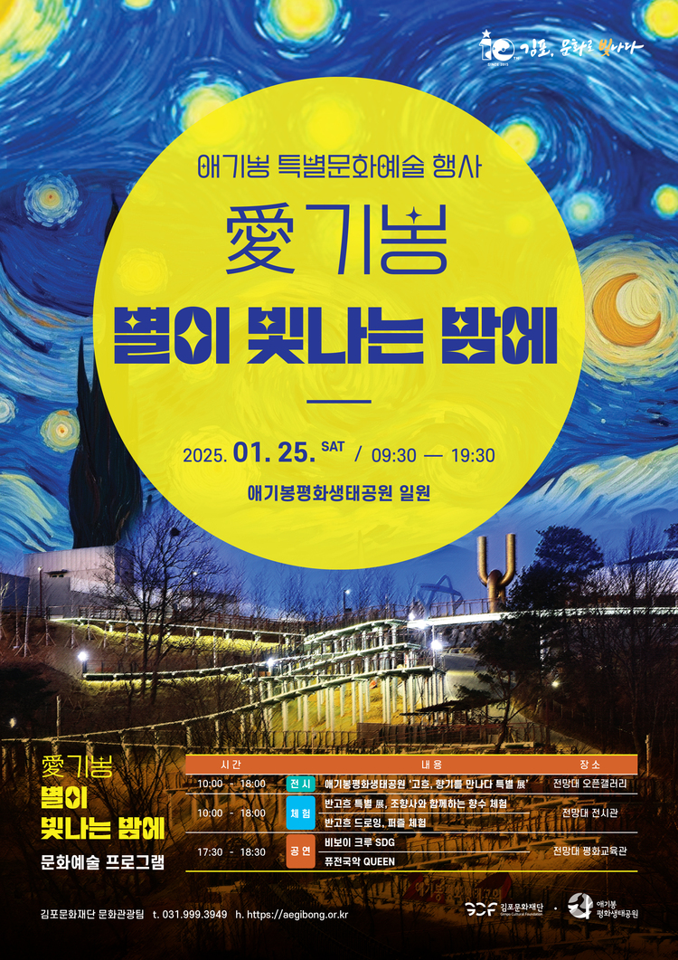 이번 행사는 ‘별이 빛나는 밤에’라는 주제로 ‘반 고흐, 향기를 만나다’ 특별 展‘(애기봉 평화생태공원 오픈 갤러리)과 함께 한다. 이 전시는 ‘조향사와 함께하는 섬유 향수 만들기 체험’이 연계되어 색채와 향기가 함께 어우러지는 전시로 관람객은 시각과 후각을 동시에 자극하는 색다른 경험을 할 수 있다는 점이 특징이다. 이밖에도 반 고흐 그림 퍼즐맞추기, 반고흐 드로잉 체험도 마련되어 있다.