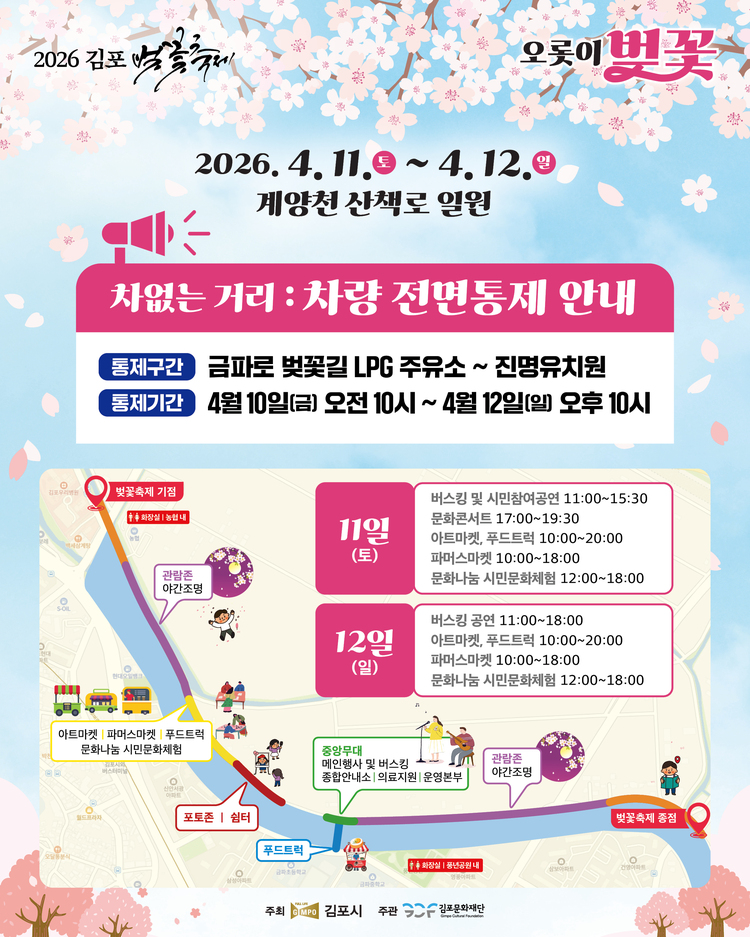 [이트레블뉴스=김미숙 기자] 경기도 김포시가 오는 4월 11일부터 12일까지 양일간 계양천 일원에서 2026 김포 벚꽃축제를 개최하고 시민들에게 화사한 봄의 정취를 선사한다. 김포의 대표적인 벚꽃 명소인 김포본동에서 사우동에 이르는 계양천 산책로를 배경으로 열리는 이번 축제는 오롯이 벚꽃이라는 주제 아래 차별화된 콘텐츠로 상춘객들을 맞이할 준비를 마쳤다.